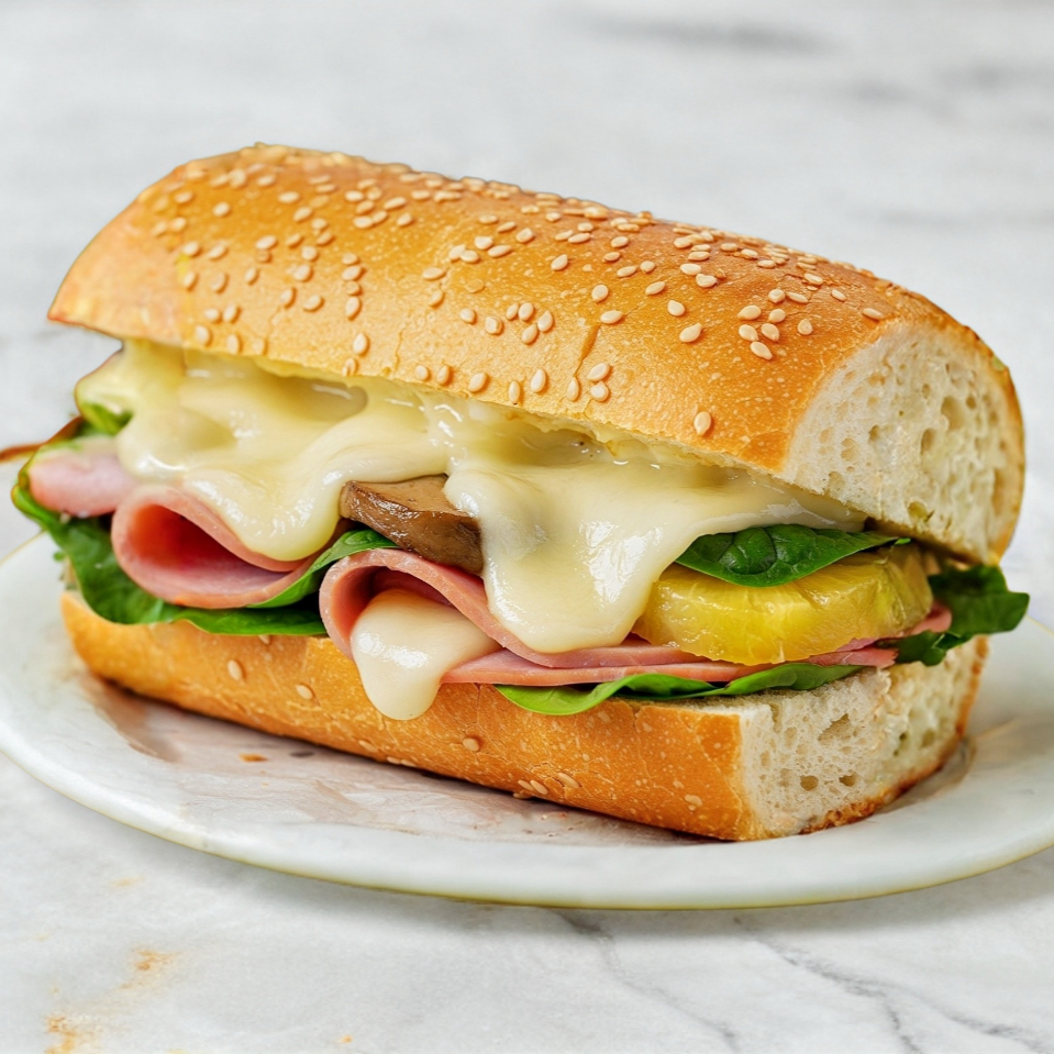 Pan integral artesanal, jamón de pavo, champiñones, piña, queso manchego y espinacas (con mayonesa finas hierbas).