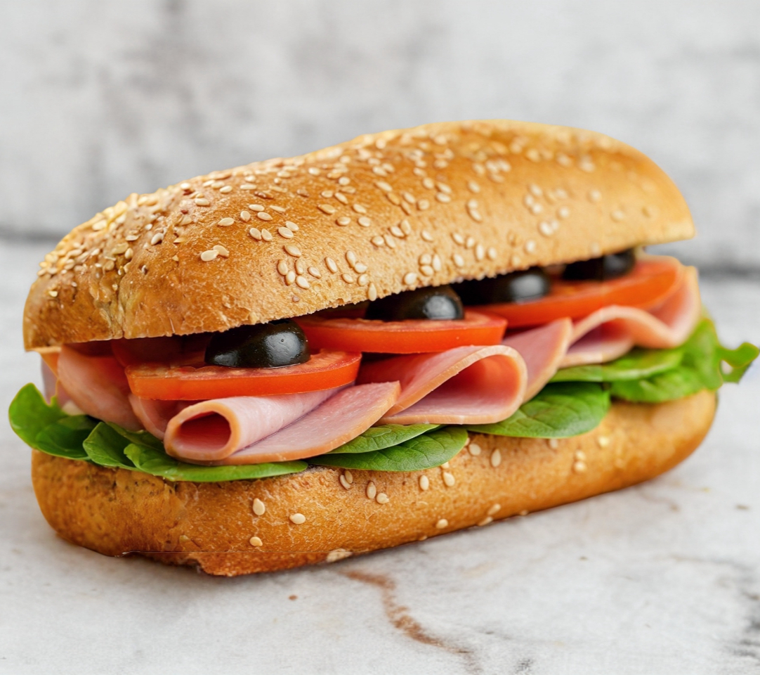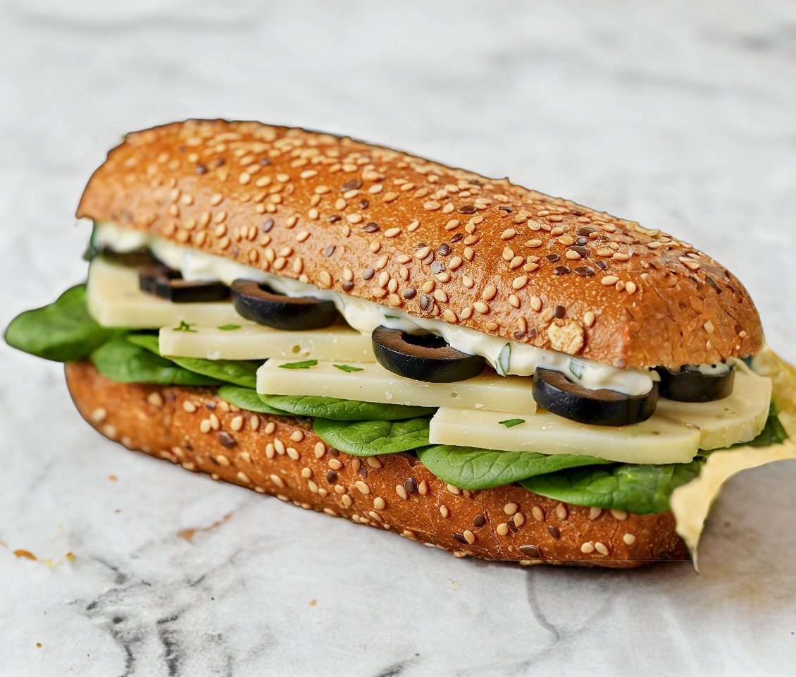 Pan integral artesanal, jamón de pavo, queso panela, espinacas, aceitunas y jitomate (con mayonesa de finas hierbas).