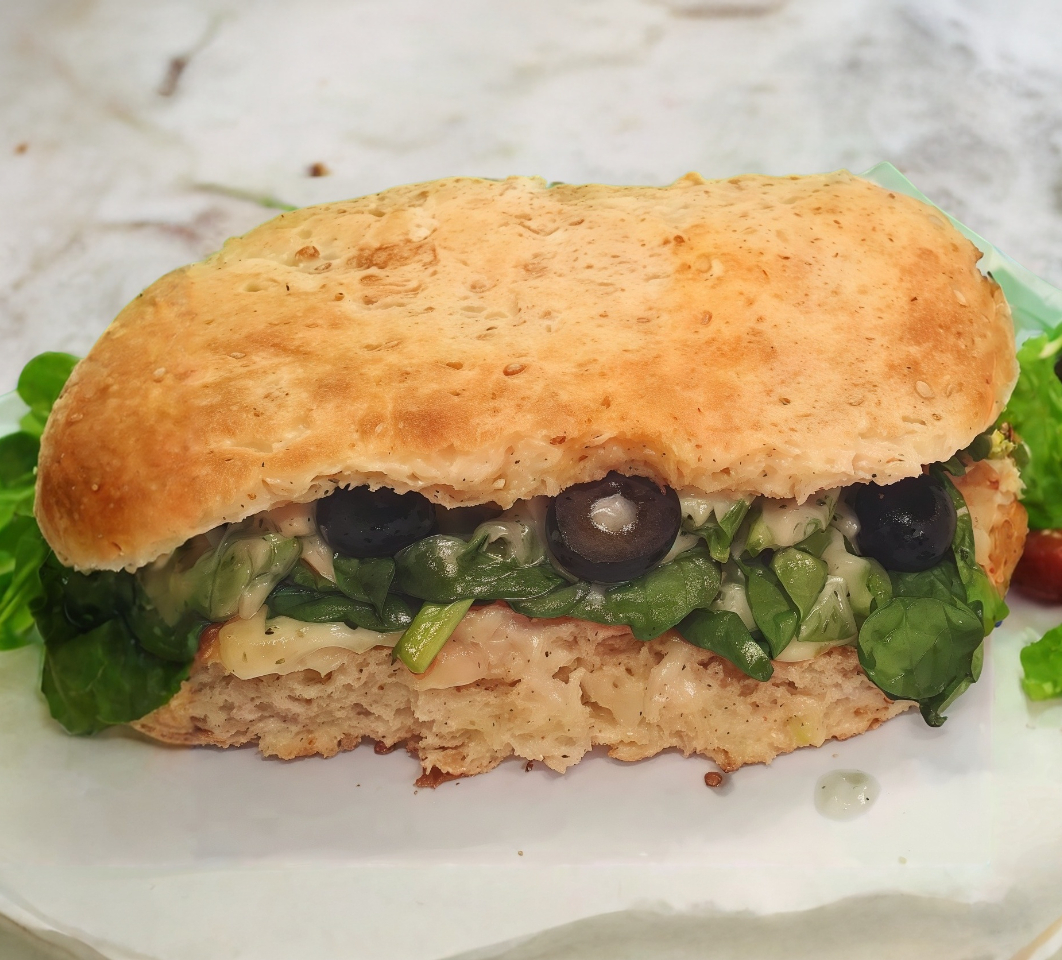 Pan integral artesanal, pollo, espinacas, aceitunas y manchego (con mayonesa de finas hierbas).