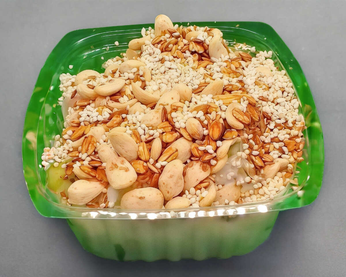 Ensalada de fruta de la temporada, preparada con yogur natural, granola, cereal, miel y amaranto.