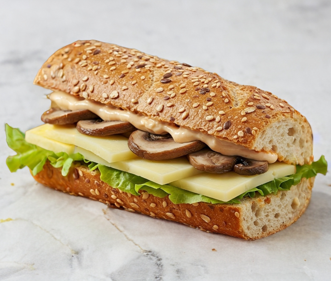 Pan integral artesanal, pollo, champiñones, queso manchego, aguacate y lechuga (con mayonesa chipotle y jalapeños).