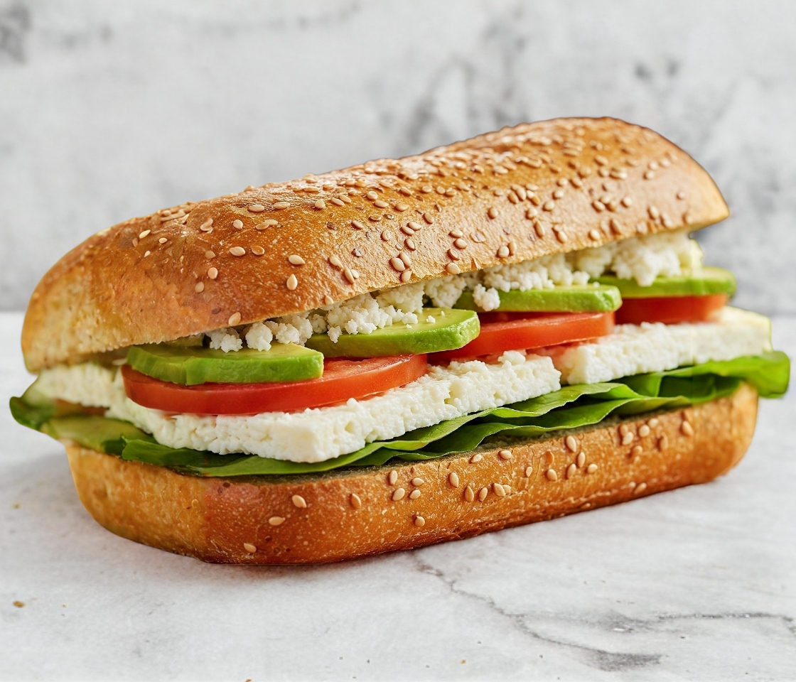 Pan integral artesanal, pollo, queso panela, jitomate, aguacate y lechuga (con mayonesa chipotle y jalapeños).