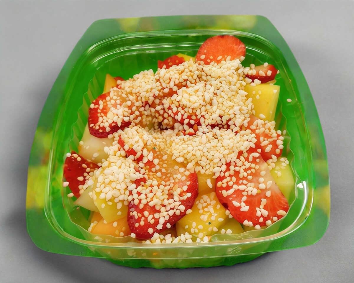 Ensalada de fruta de la temporada, preparada con miel y amaranto.
