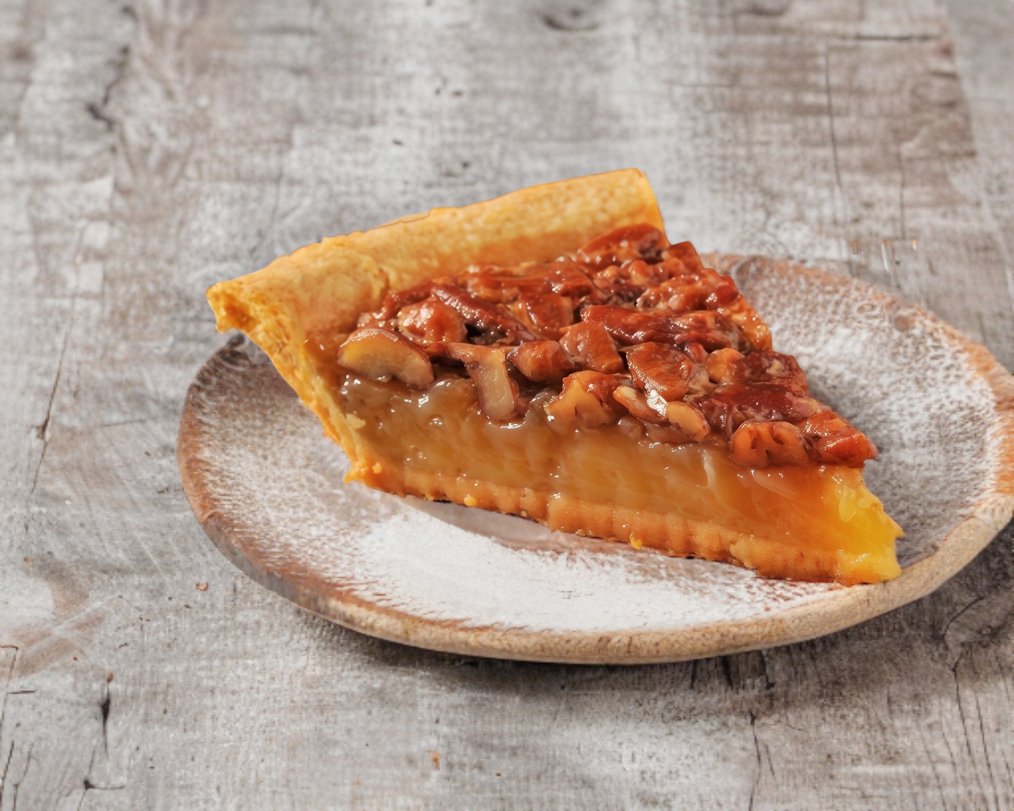 Rebanada de exquisito postre que combina la textura cremosa y el sabor rico y profundo de un relleno de nuez tostada, todo sobre una base de masa suave