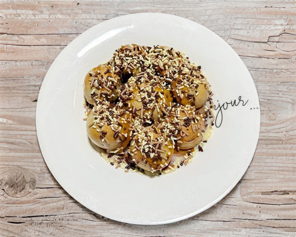 Delicioso pan de vainilla, acompañado de crema batida, crema de chocolate, nuez y chispas de chocolate