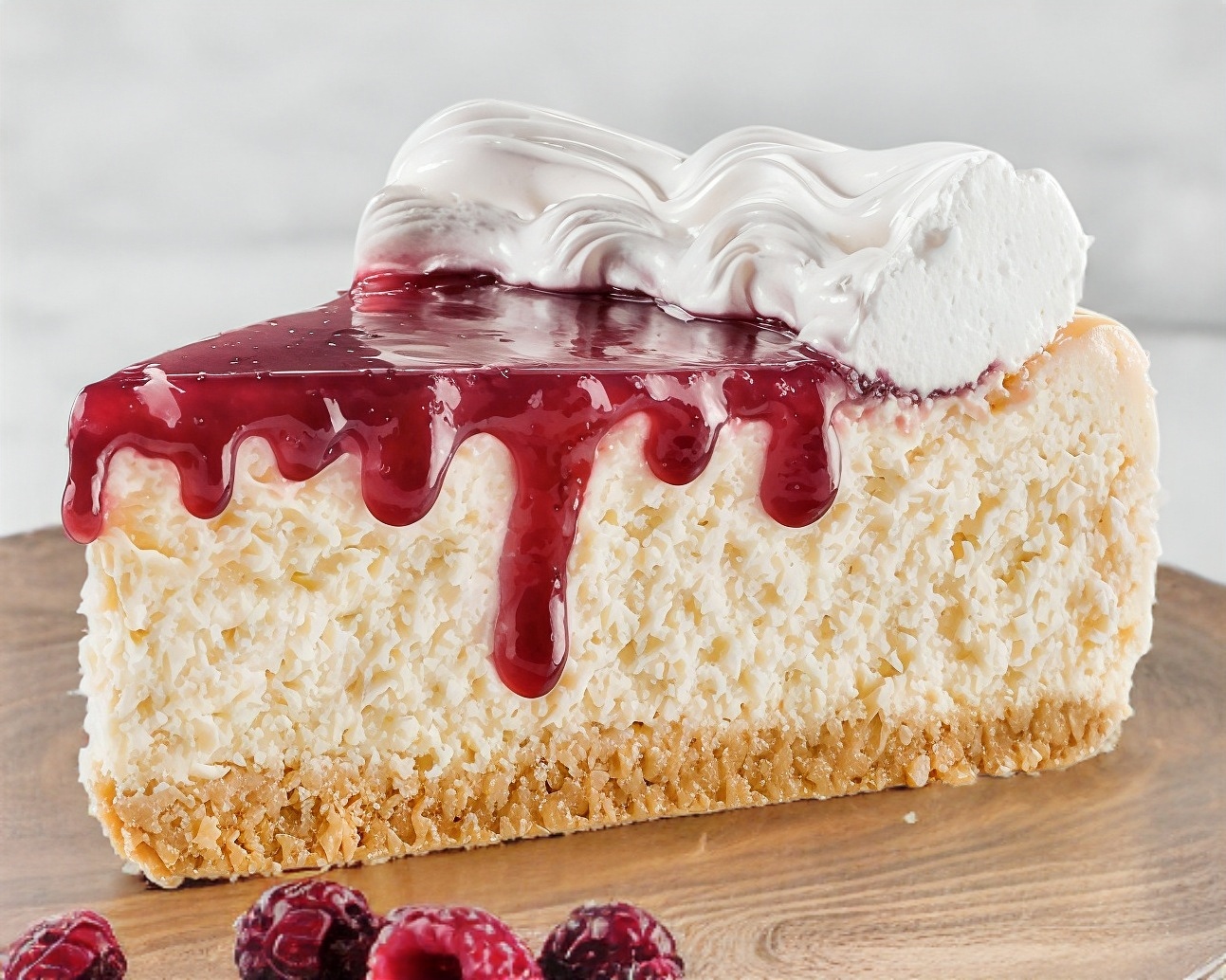 Rebanada de pay de queso con delicioso espejo de frambuesa