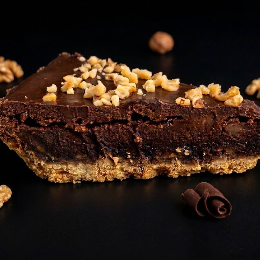 Para los amnates del chocolate, delicioso pie de brownie con nuez, decorado con nuez de castilla