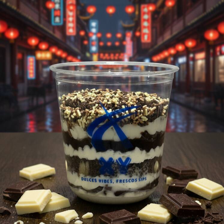 Deliciosa combinación de pan de chocolate, crema batisa, chocolate blanco, chocolate de leche y granillo de chocolate