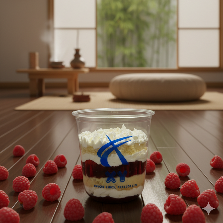 Deliciosa combinación de pan de vainilla con crema batida, frambuesas y salsa de frambuesa.