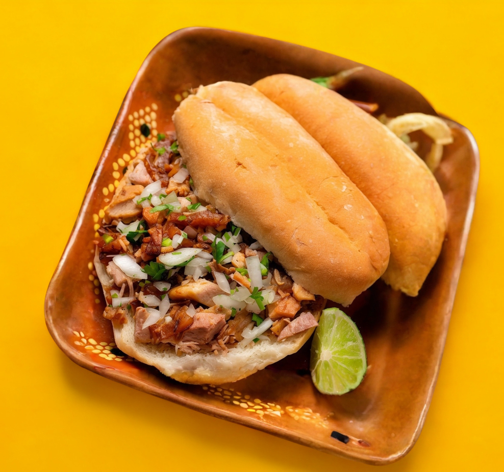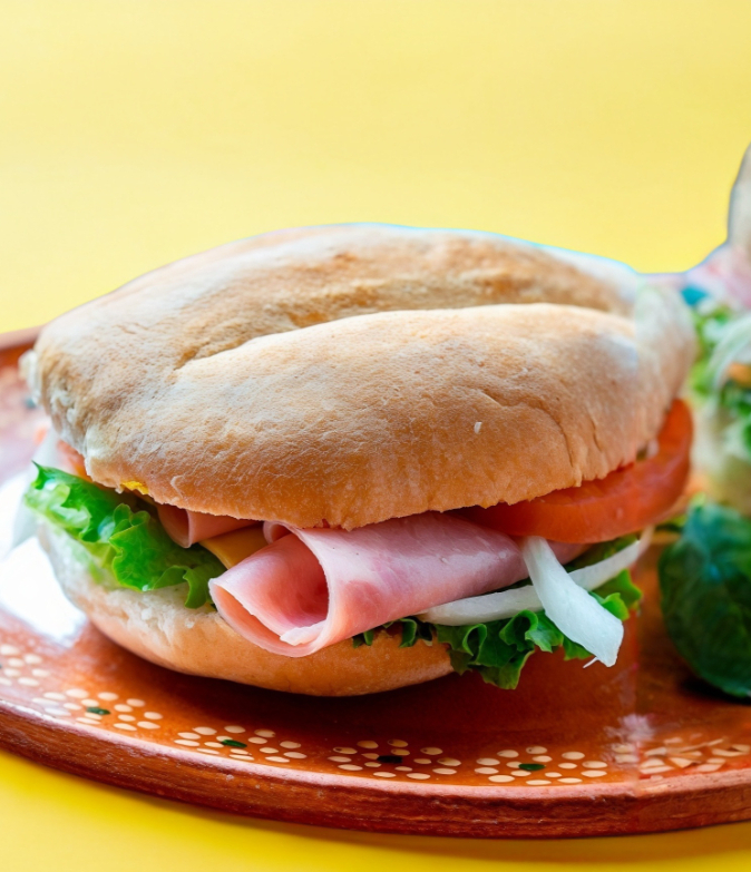 Jamón, queso de puerco , queso amarillo, queso blanco , aguacate, tomate cebolla, mayonesa y mostaza