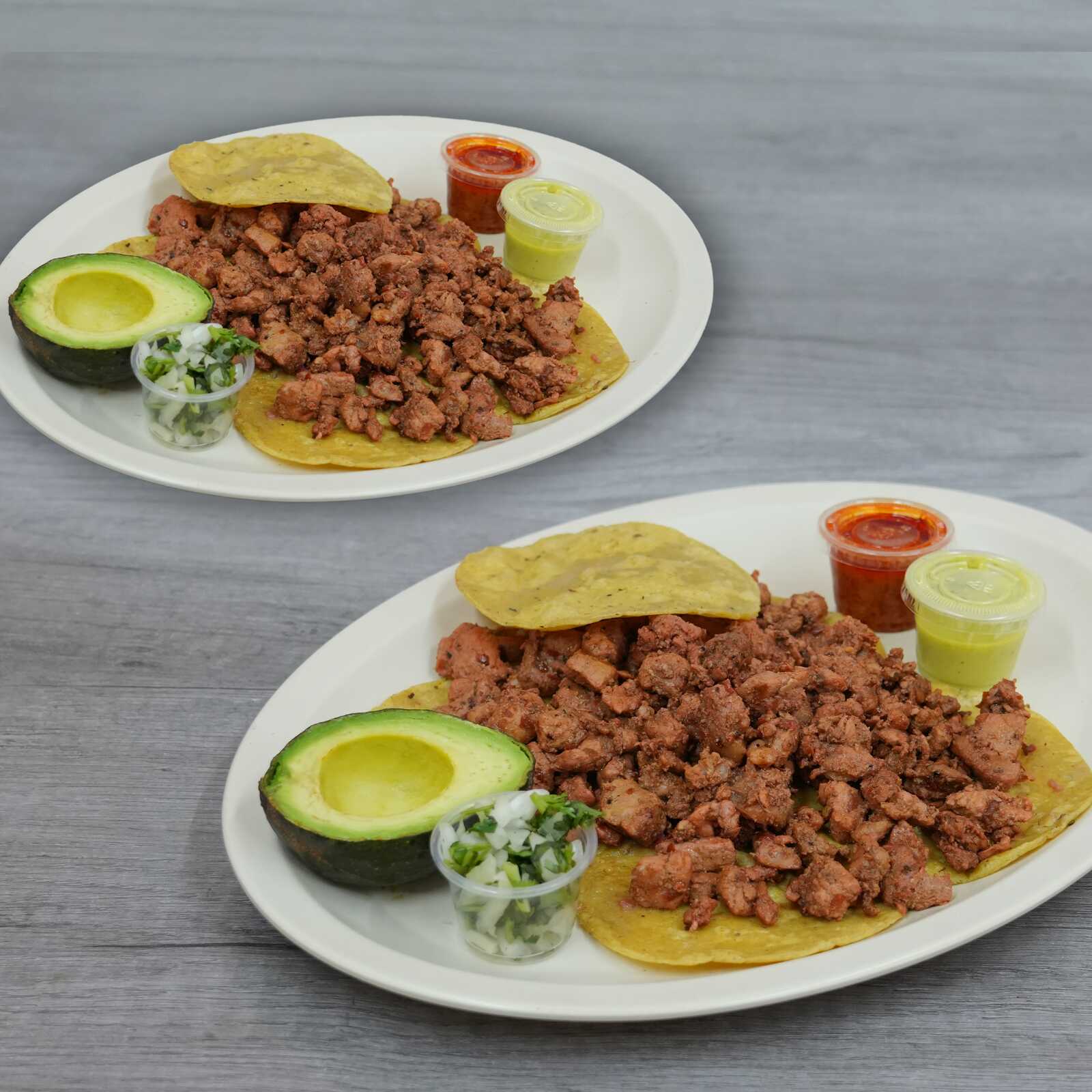Combo de 2 órdenes de Tacos de tortilla de maíz amarillo, con 200 gr de jugosa carne de pastor a la plancha, acompañado de aguacate fresco y rica salsa picante.