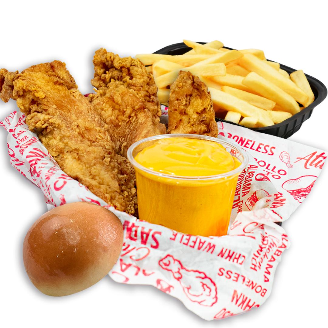 Tenders 3 pz con el dip de 8oz de tu elección, acompañado de 180 gr papas fritas y panecillo de la casa