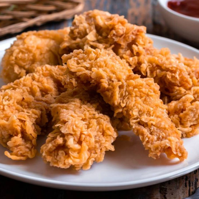 6 tiras de pechuga empanizadas, crujientes por fuera y jugosas por dentro, servidas con papas fritas, cátsup y aderezo.