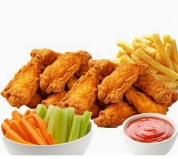 Aliitas empanizadas, crujientes por fuera y jugosas por dentro, acompañadas de papas fritas, verduras frescas, cátsup y aderezo ranch.