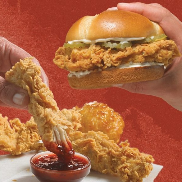 Kikiri-sándwich de tiras de pechuga empanizadas, crujientes por fuera y jugosas por dentro, con aderezo y pepinillos.
