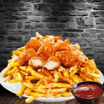 Ricas papas fritas bañadas en salsa búfalo, cubiertas con cremoso queso para nachos y acompañadas de jugosos boneless en irresistible combinación búfalo-ranch. 🔥🧀🍟
