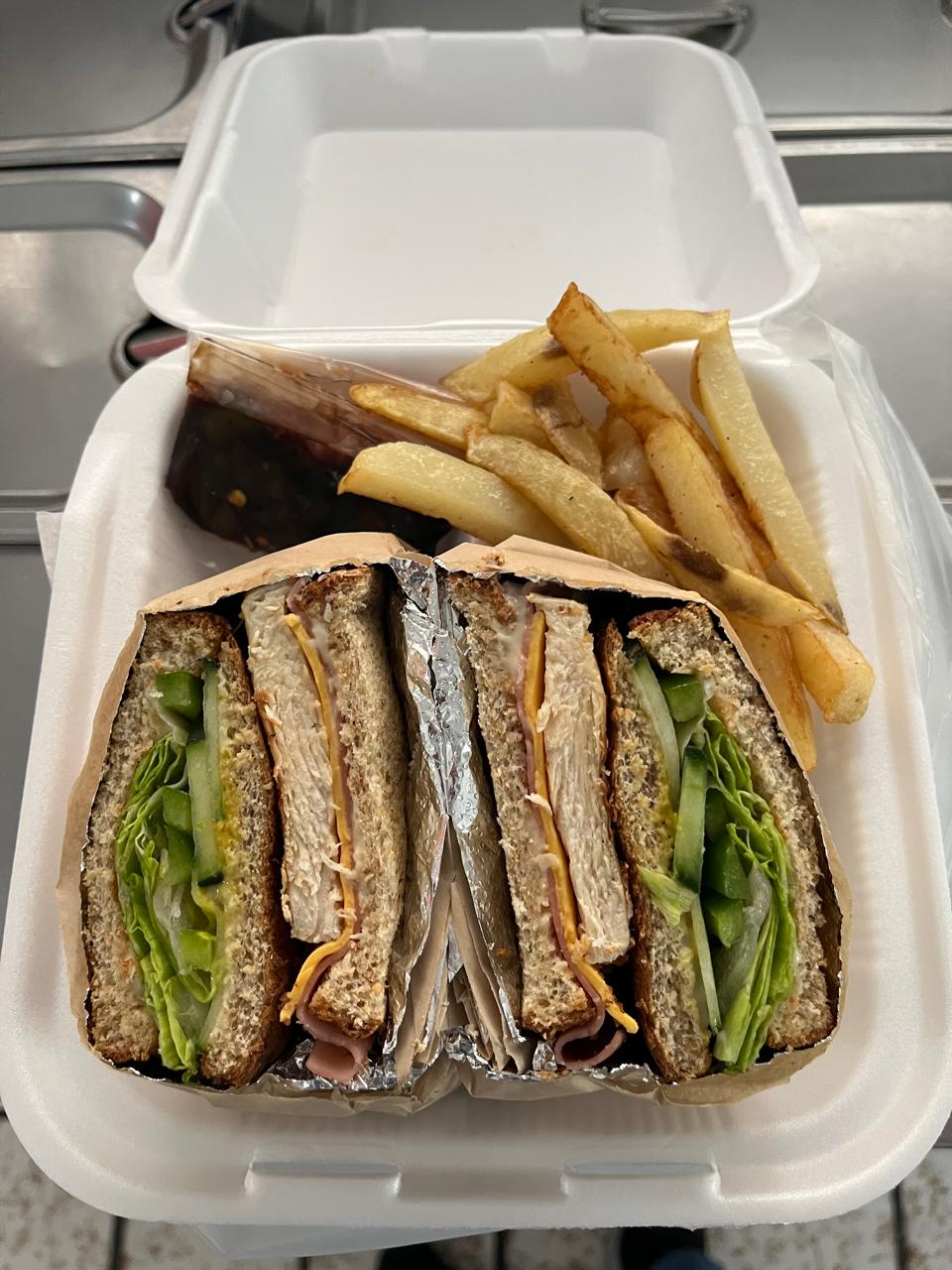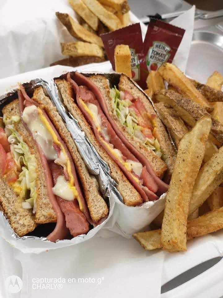 3 Piezas de pan integral, pechuga a la plancha, jamón, queso amarillo, lechuga pepino y morron.
