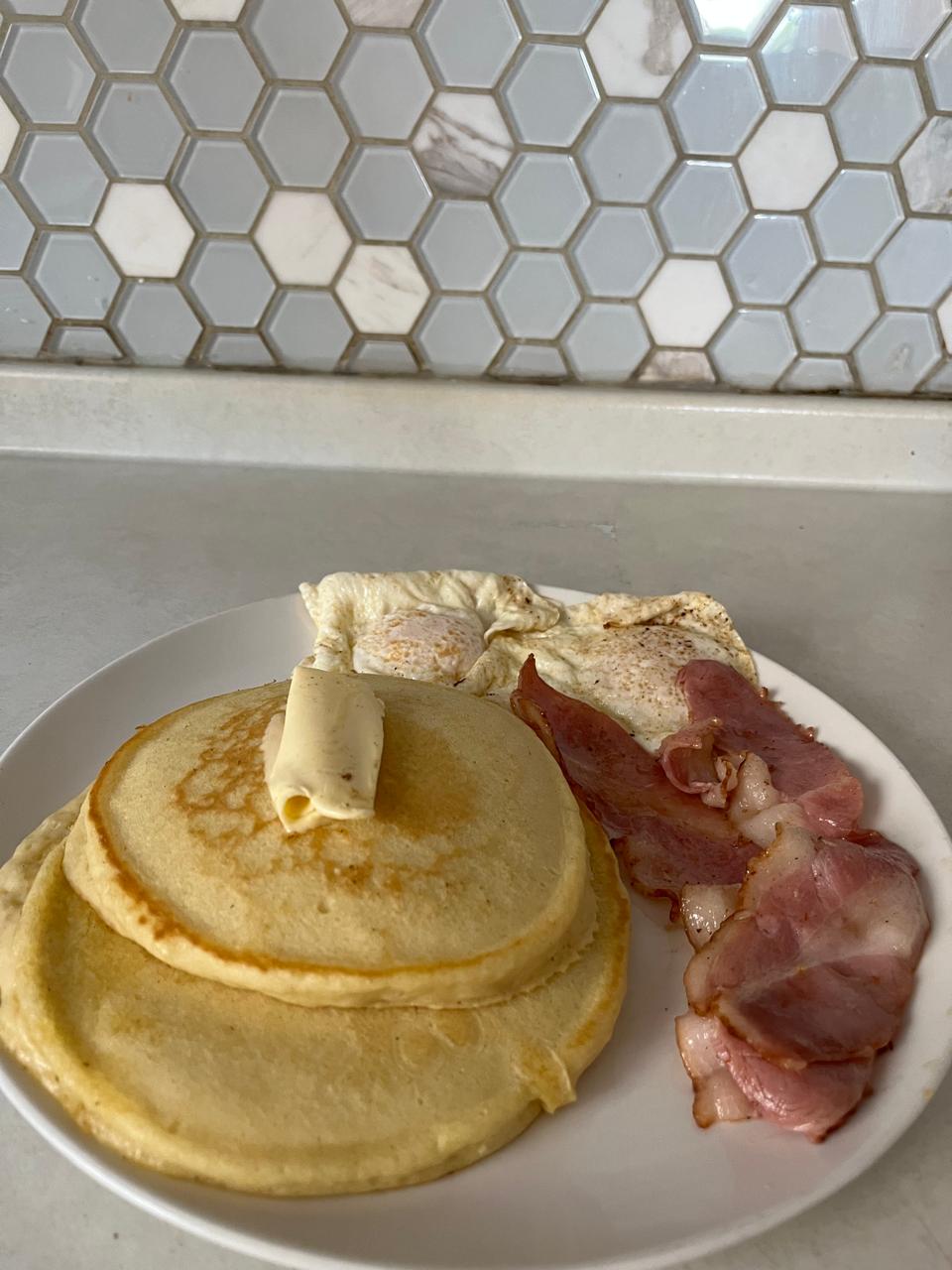 Desayuno para Uno: 2 Hot Cakes, 2 Huevos Estrellados y 2 tiras de tocino.