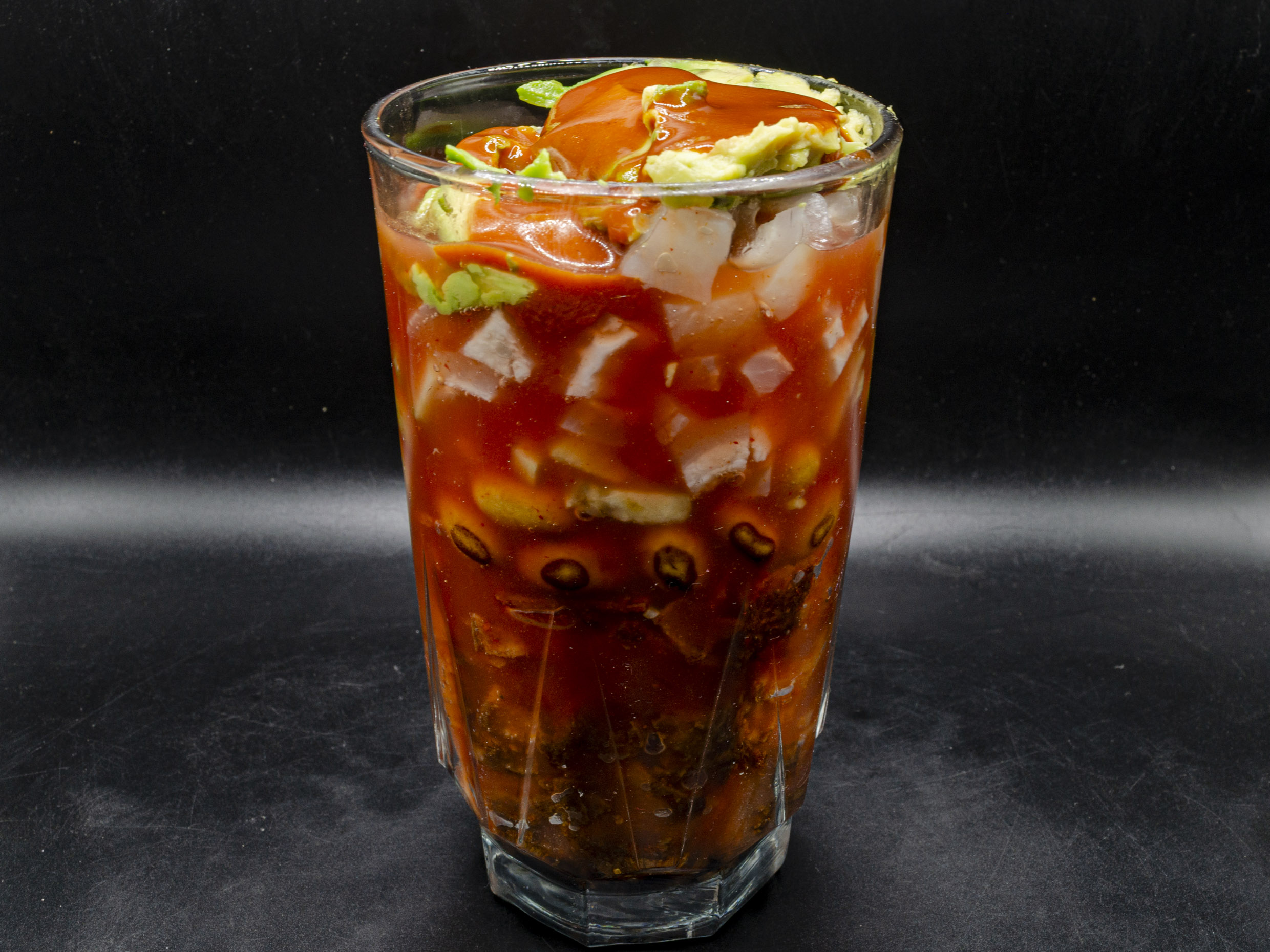Vaso con tostaditas, cacahuate japones,cueritos, aguacate,pepino, cilantro, limón , pimienta ,salsas negras y Clamato