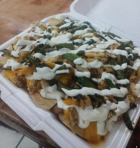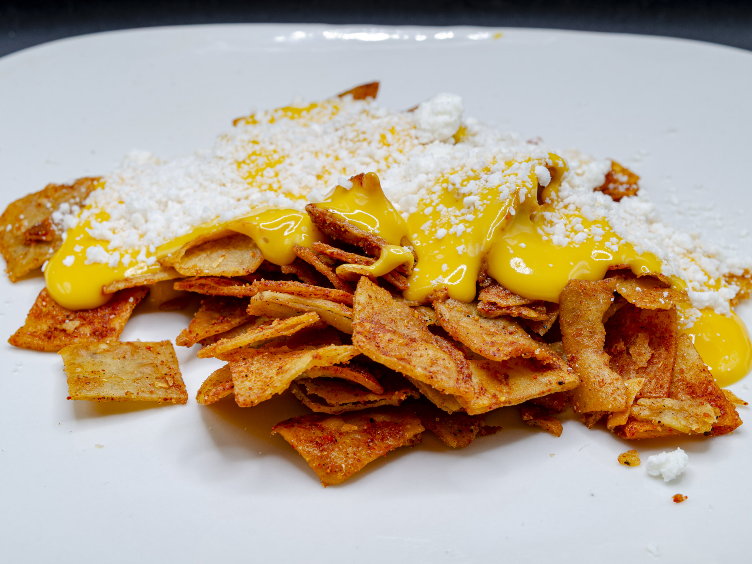 Totopos, queso amarillo, 400 g de pechuga a la plancha con rajas de jalapeño y crema (plato 8x8).