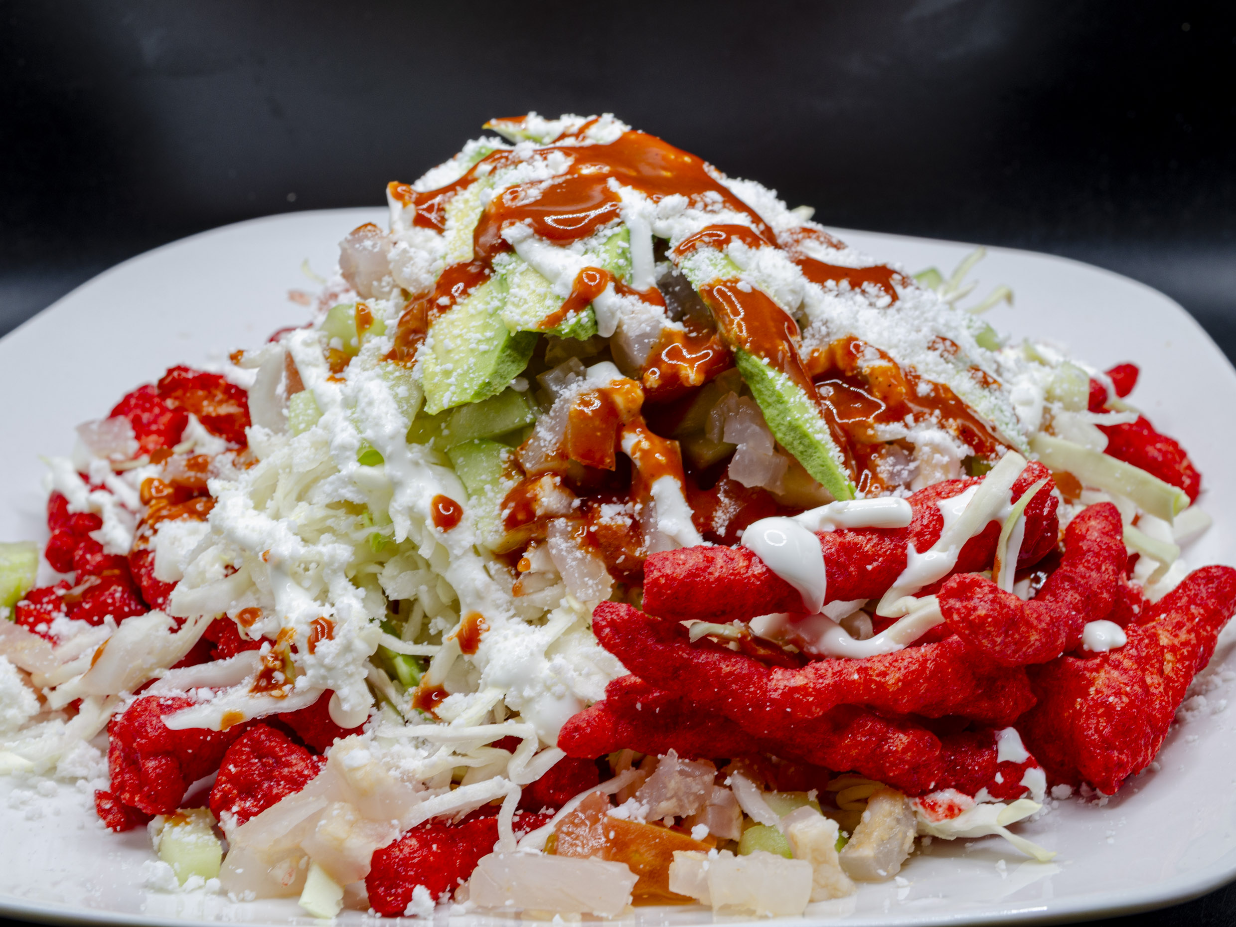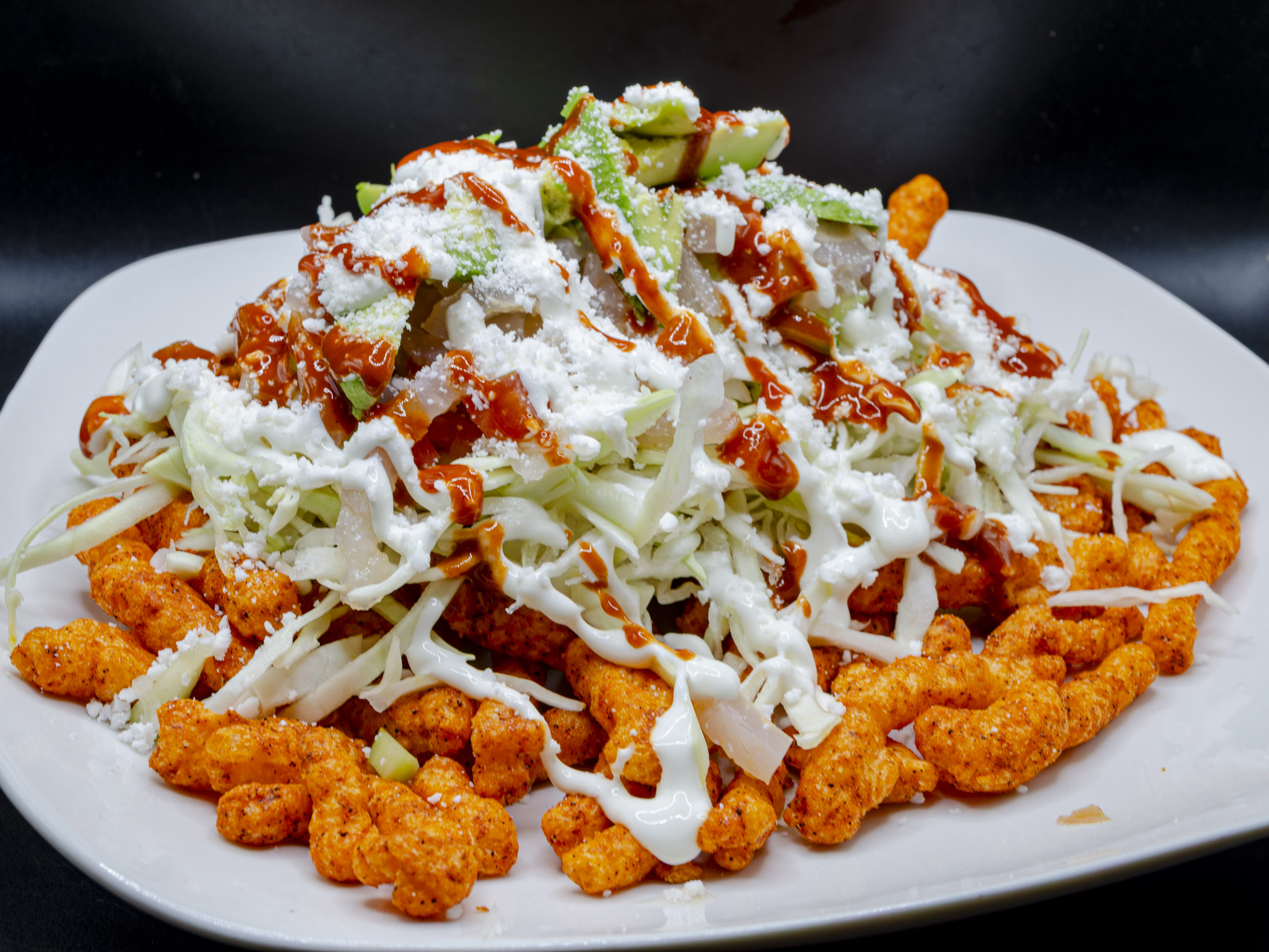 Chettos Flaming con repollo, tomate,cueritos, aguacate, queso p/elote, pepino, crema, limón, (salsa picante a parte)