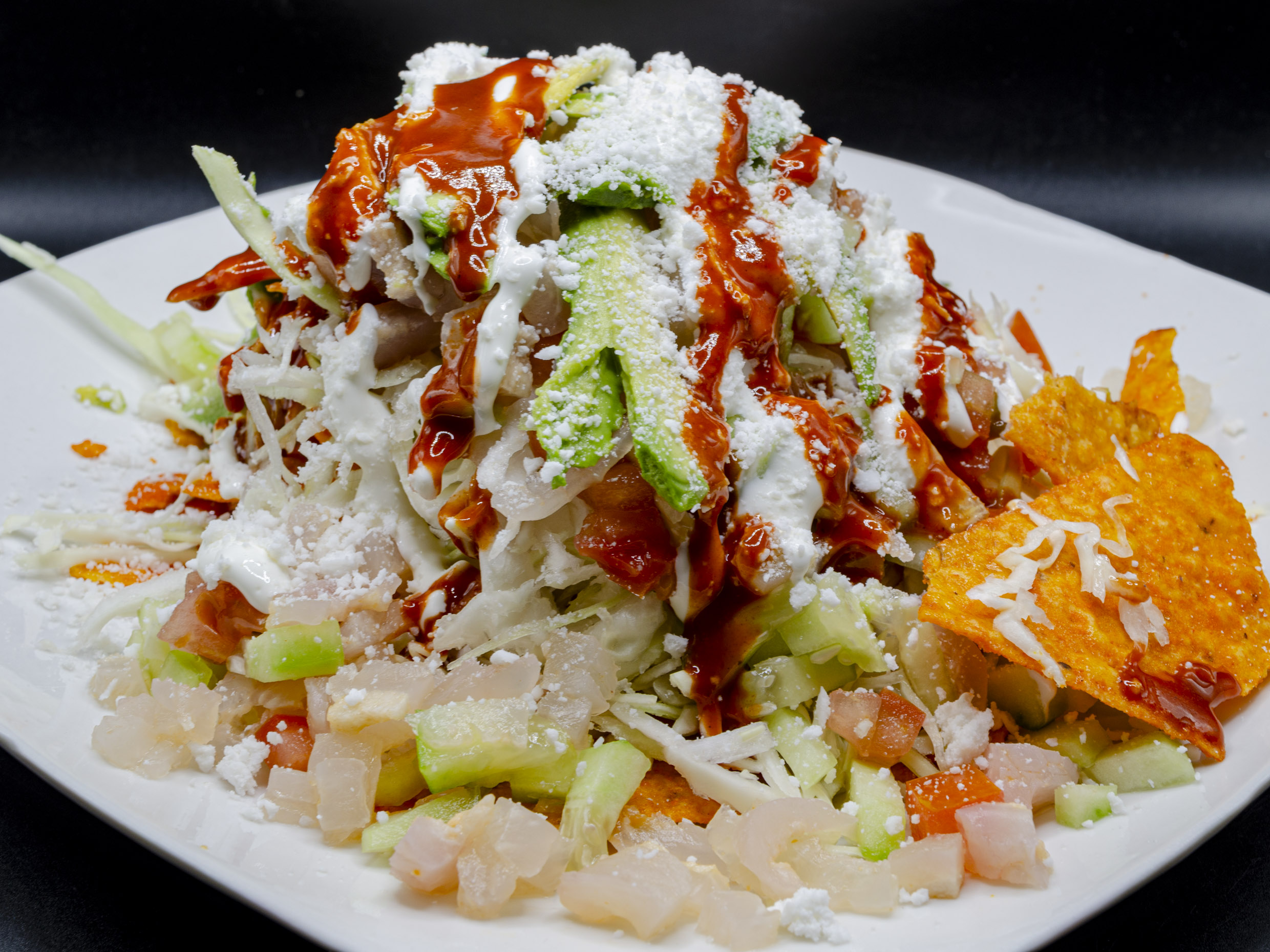 Totopos, queso amarillo, carne deshebrada, guacamole con pico de gallo y curtidos (plato 8x8).