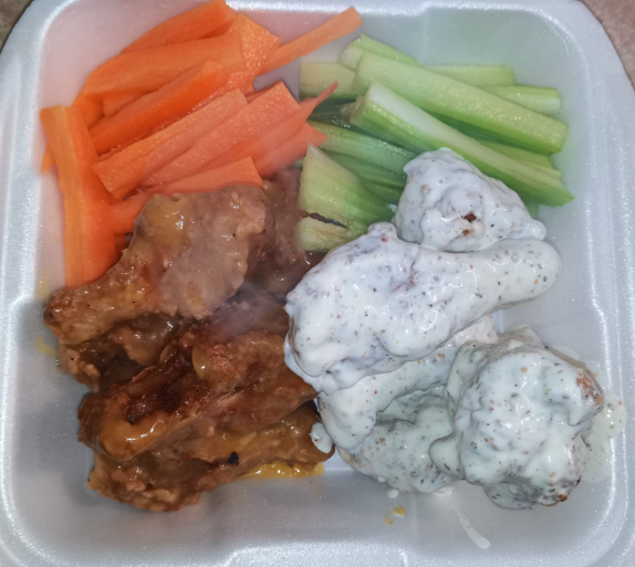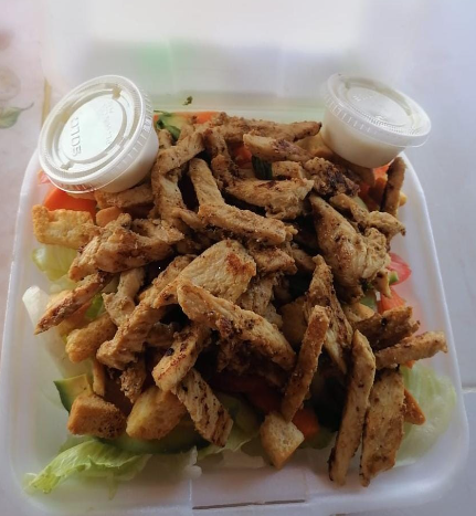 Pechuga empanizada, lechuga, zanahoria, apio, pepino, tomate, aguacate, croutones, y 2 porciones de ranch (plato 8x8).