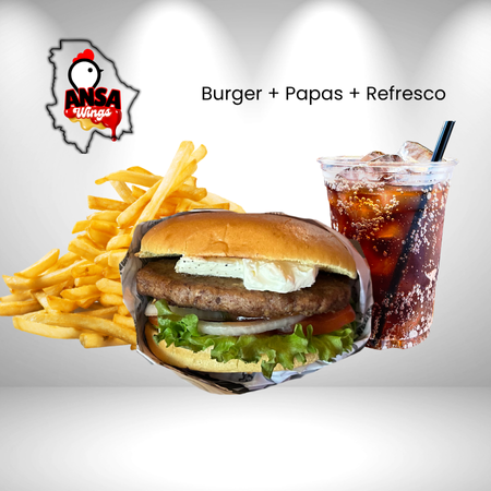 HAMBURGUESA CARNE DE RES QUESO PAPAS Y REFRESCO
