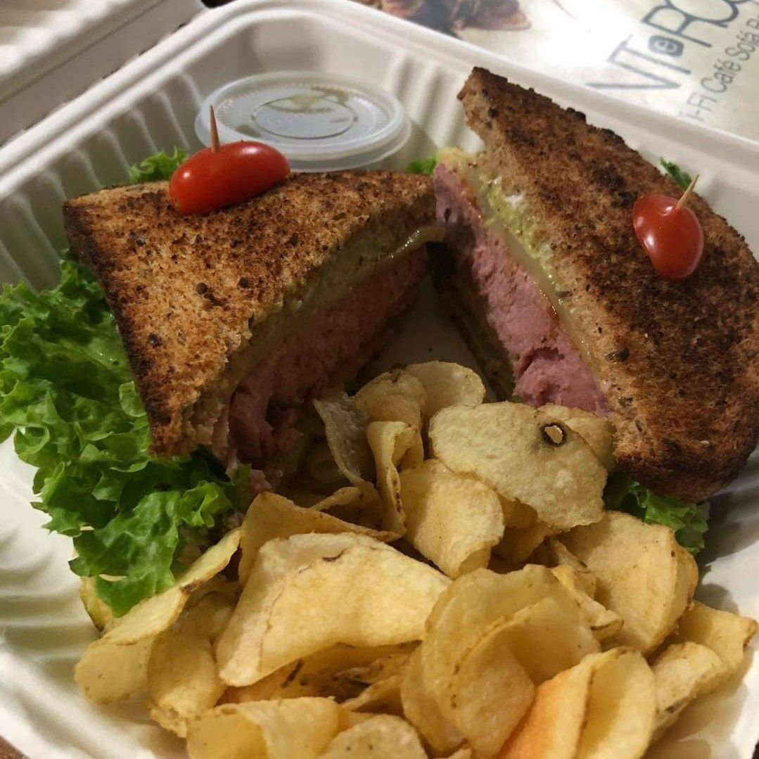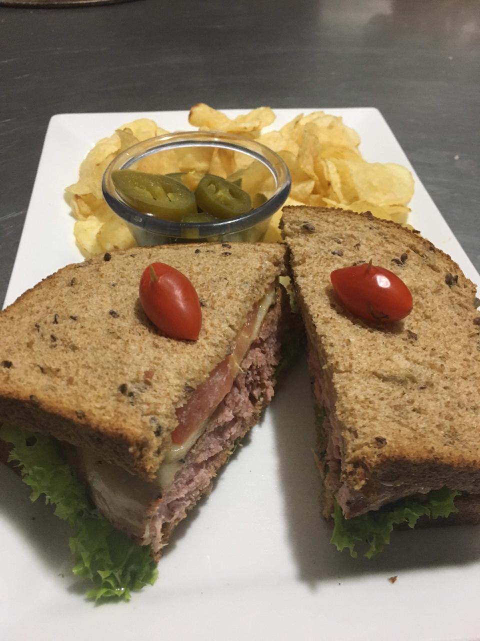 Pan integral tostado, mayonesa, jamón de pavo, roast beef, queso, aguacate, tomate y lechuga.