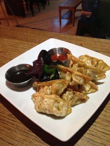 8 Piezas empanaditas doradas rellenas de pollo y vegetales, acompañadas de salsa inglesa y sriracha.