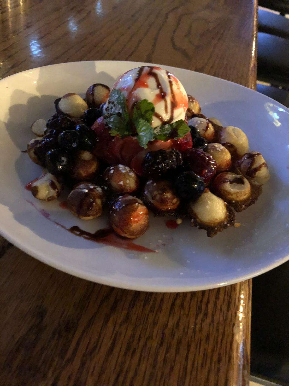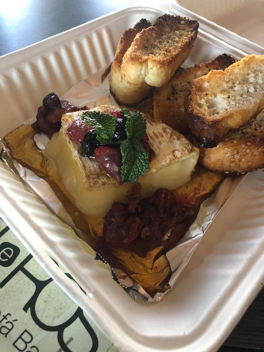 Queso fresco suave de origen francés, bañado con miel acompañando con nuez, uvas y panecillo tostado.