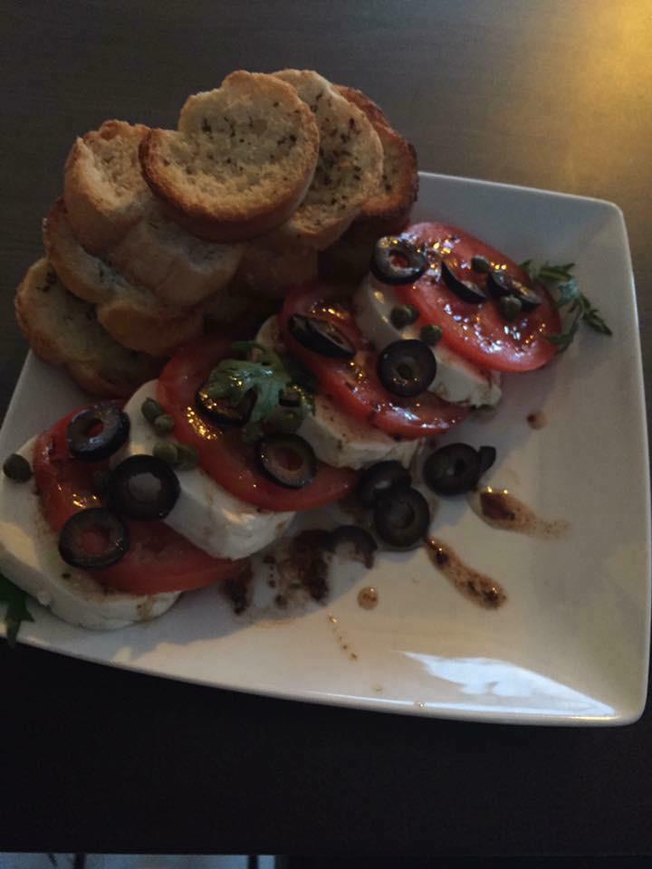 Queso mozzarella fresco con tomate bañados con oliva y balsámico.
