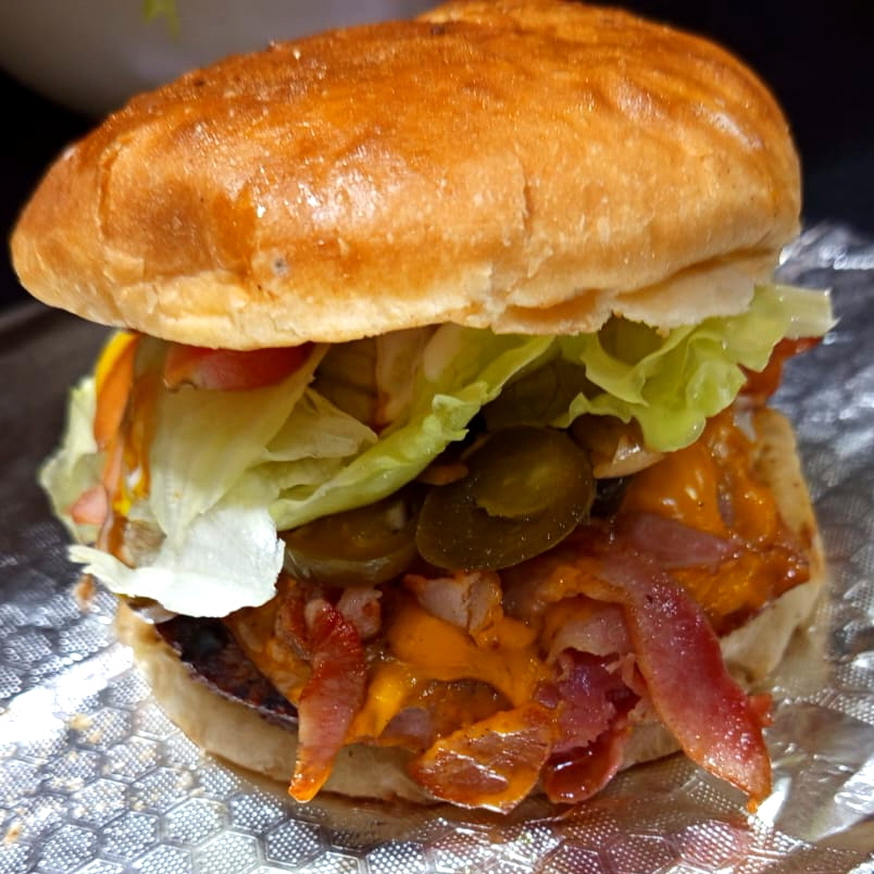 160 gr de carne asada al carbón, bañada en salsa bbq/chipotle, con tocino y queso amarillo.