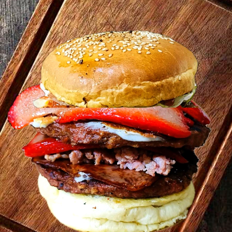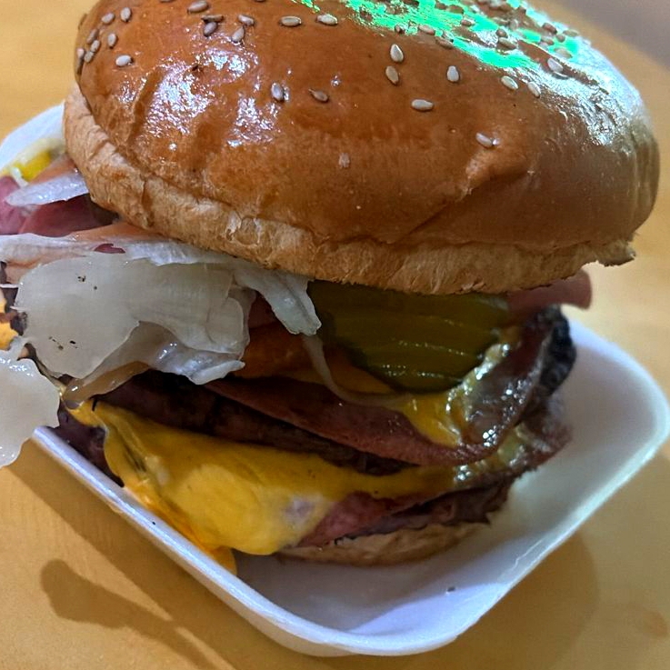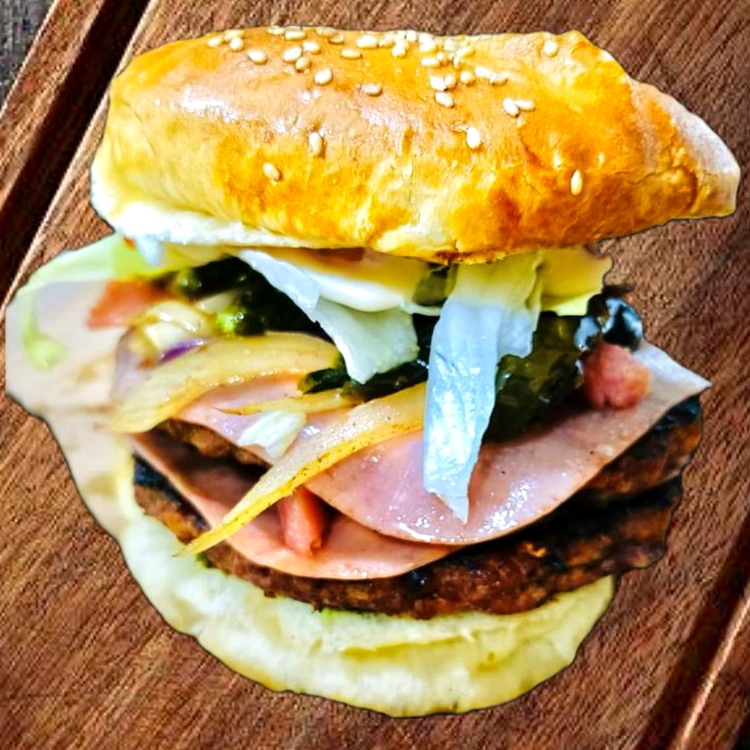 Doble carne asada al carbón (320 gr), doble jamón, doble queso, winnie, aguacate, tomate, pepinillos, cebolla caramelizada y lechuga