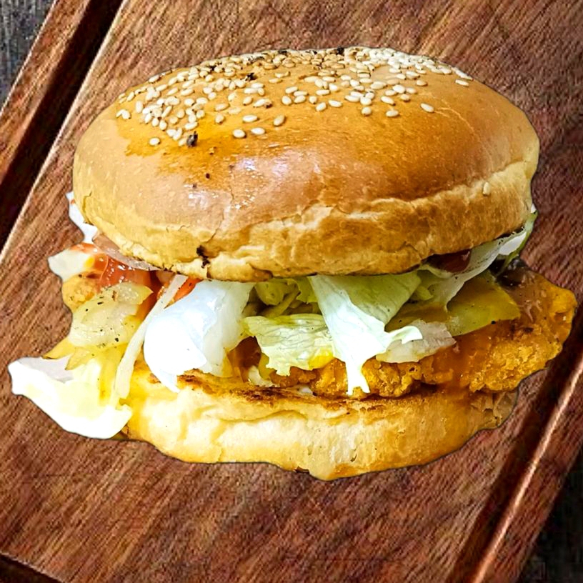 Pechuga de pollo empanizado, jamón, queso menonita, aguacate, cebolla caramelizada, tomate y lechuga