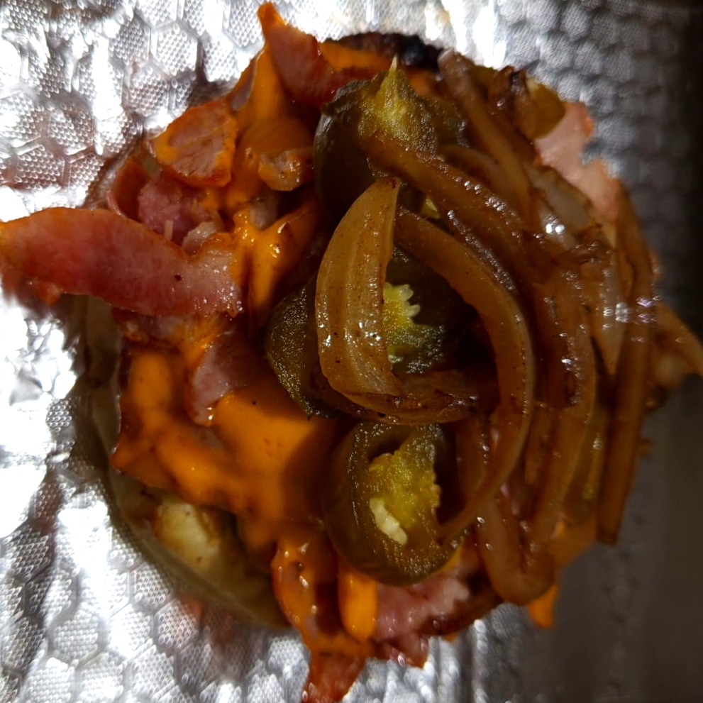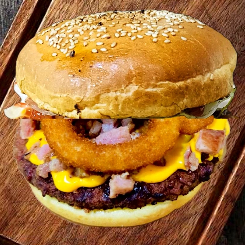 Carne asada al carbón, bañada en salsa bbq, tocino y aros de cebolla.
