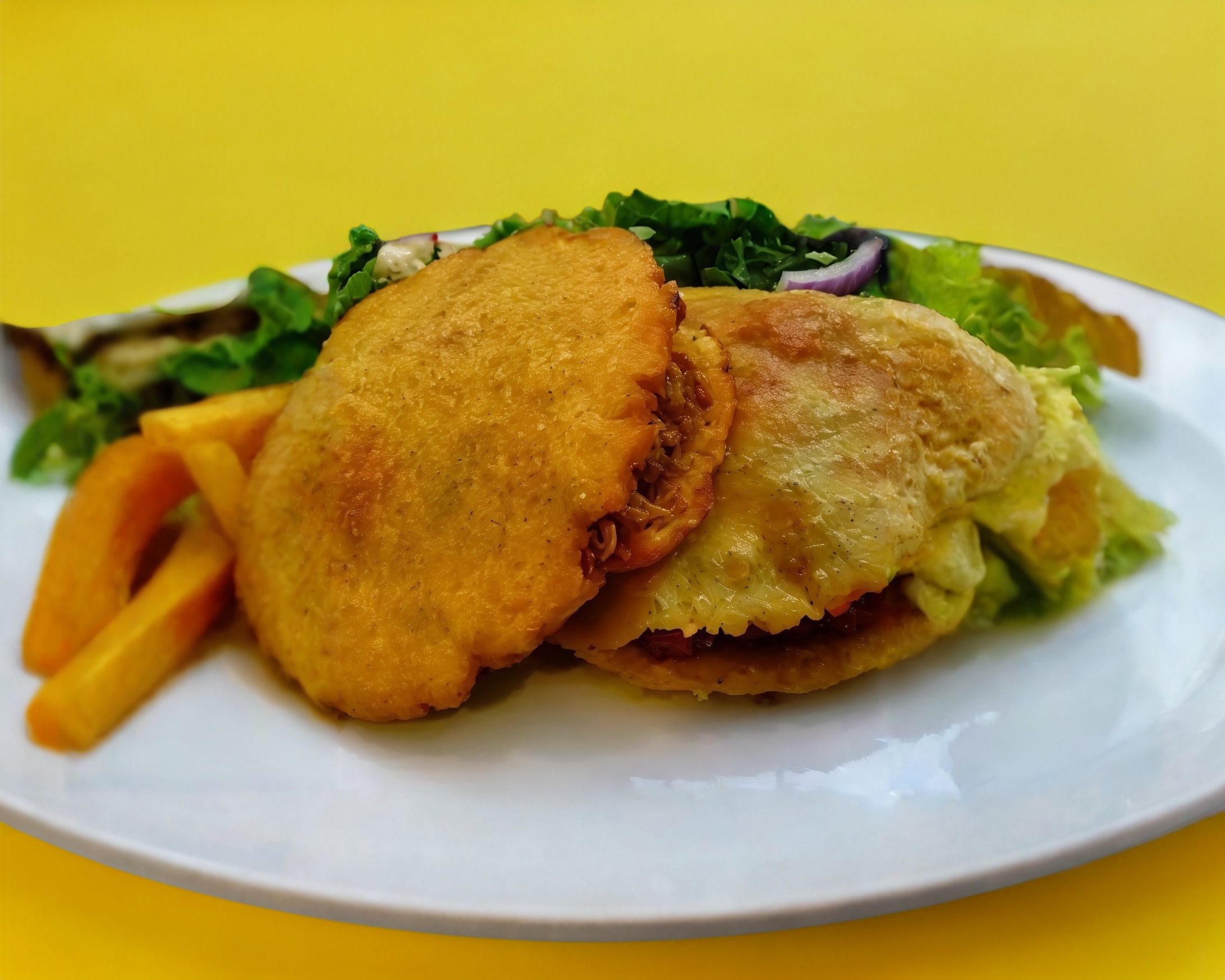 Son 4 empanadas de maíz fritas de deshebrada en verde acompañada de arroz rojo y su rnsaladitapañadad