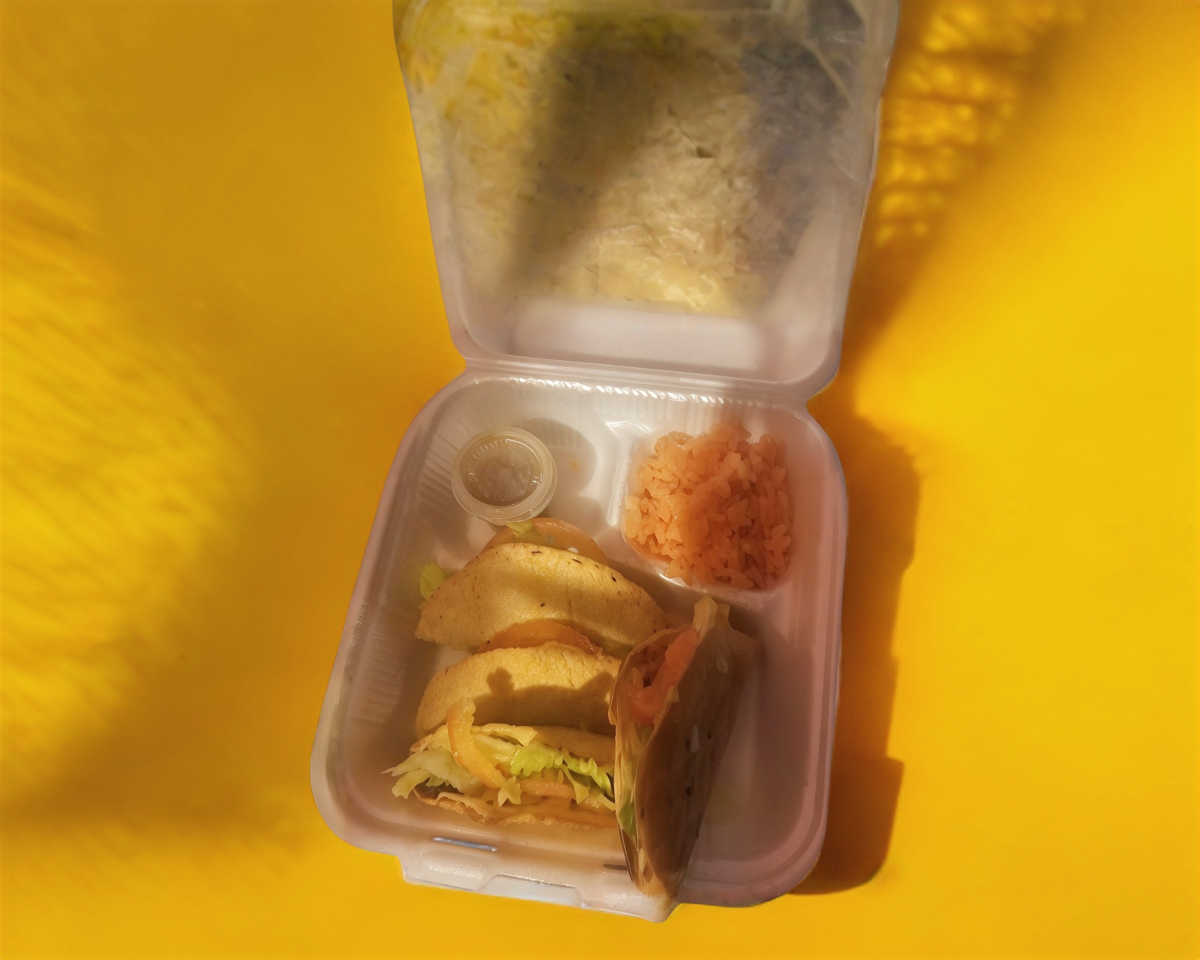 Son cuatro tacos de molida con su lechuga y tomate arroz rojo y su salsa