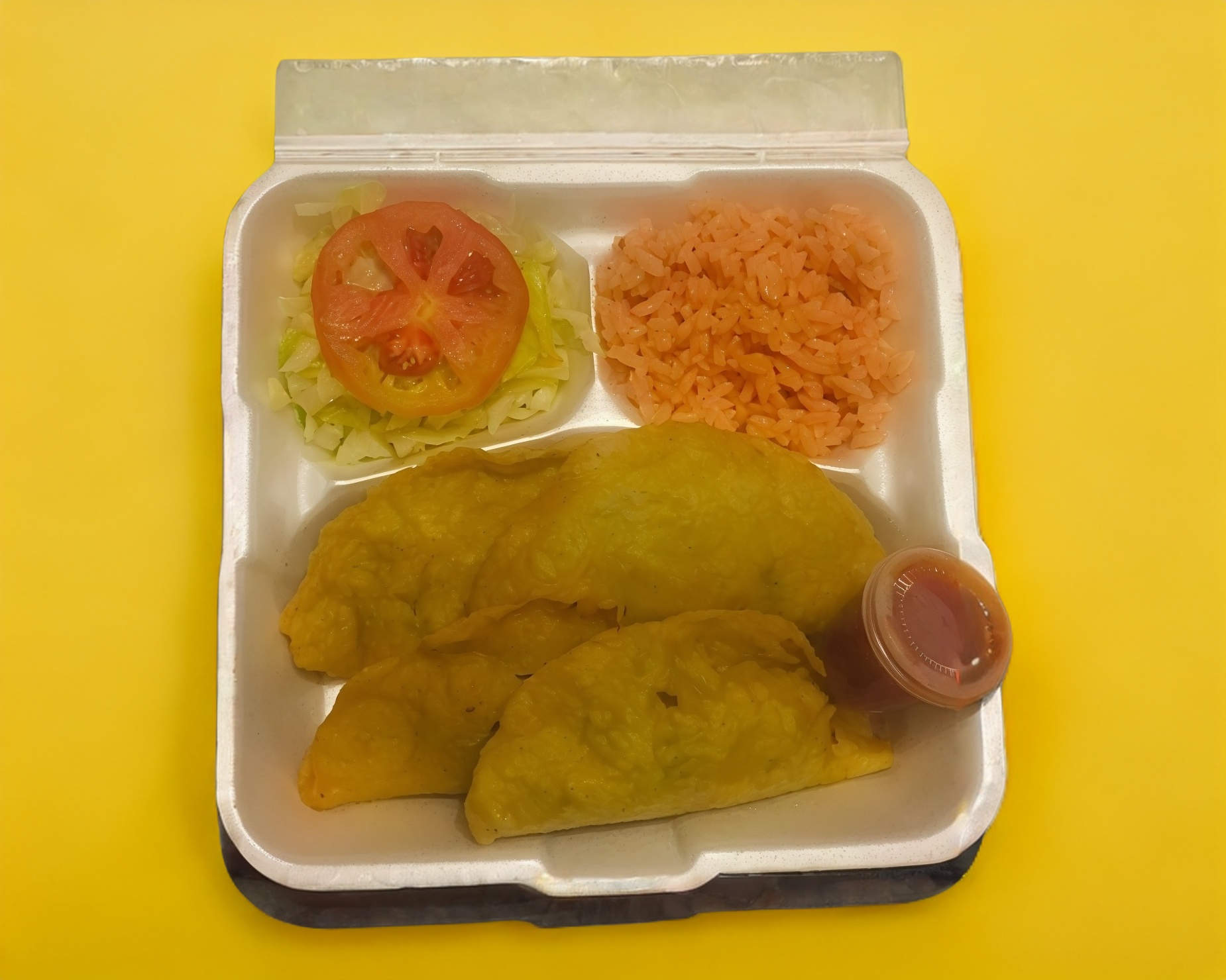 Son cuatro empanadas de picadillo con su arroz y su ensalada a acompañado de su salsa