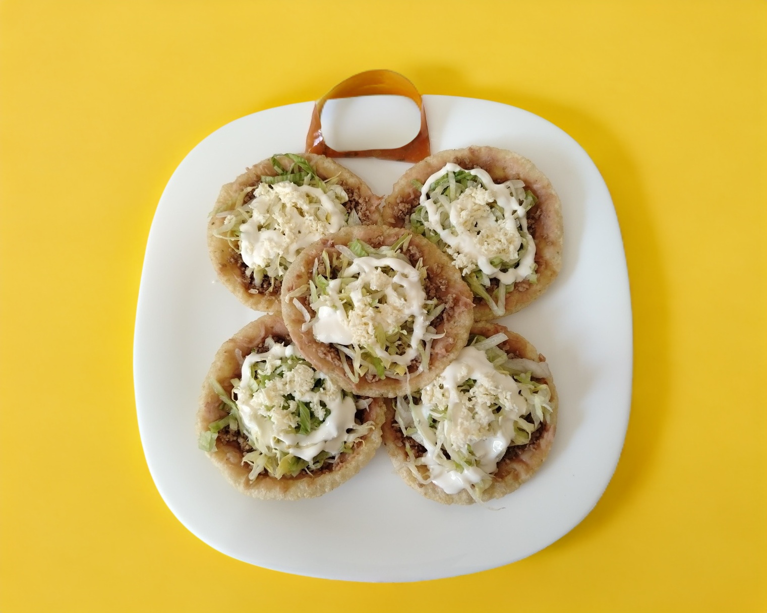 Frijol, Lechuga, Crema,queso y salsa.