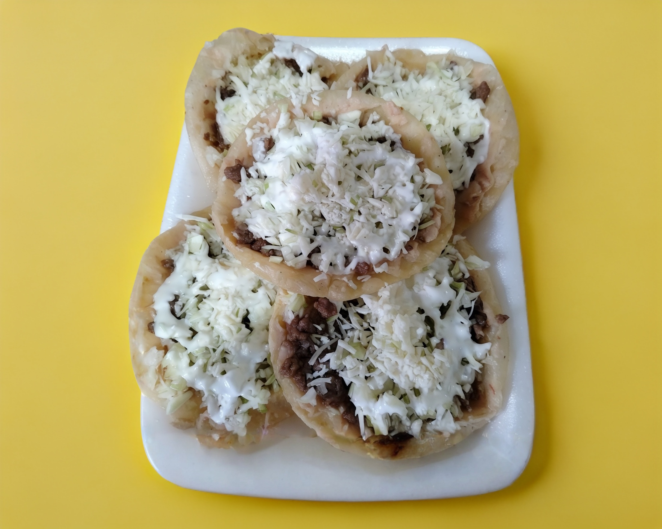 Frijoles, lechuga, crema, queso, salsa