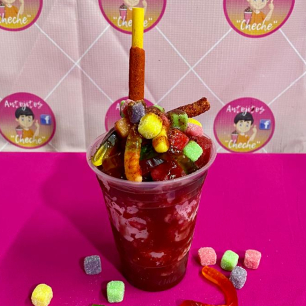 Fresas congeladas o Mangos con chamoy, variedad de gomitas, popote de tamarindo y Tajín.