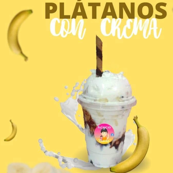 Plátano, crema, espuma, 1 Topping, 1 Jarabe, 1 popote de chocolate.