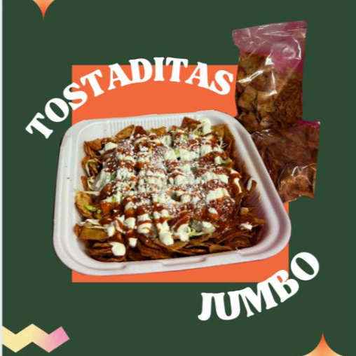 Tostaditas con jícama o pepino, cacahuates, cueritos, aguacate, clamato soya, limón y salsa picante.