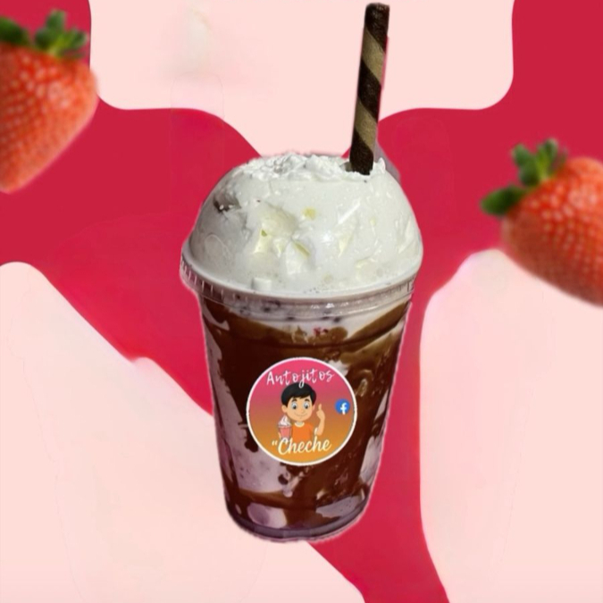 Fresas congeladas, espuma, crema, 1 Topping, 1 Jarabe liquido, 1 popote de chocolate.