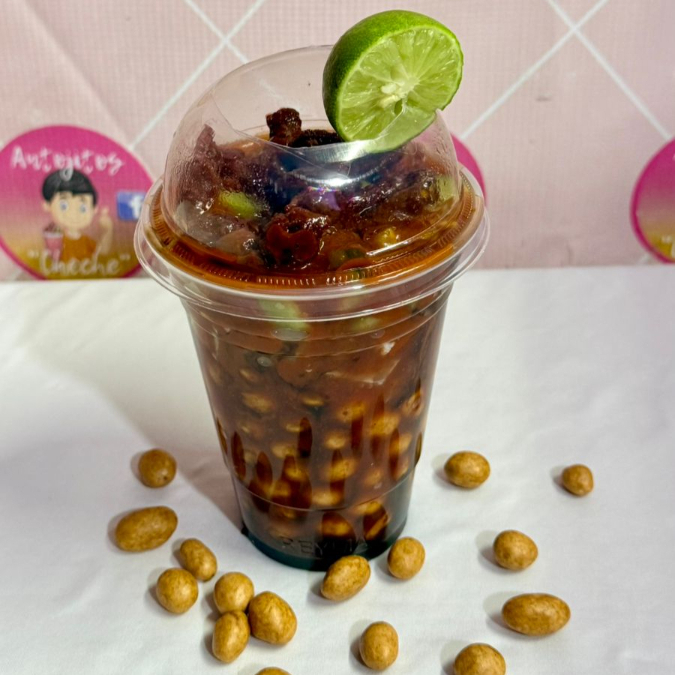Cacahuates preparados con cueritos, jícama o pepino, rielitos de tamarindo, limón, salsas y clamato,