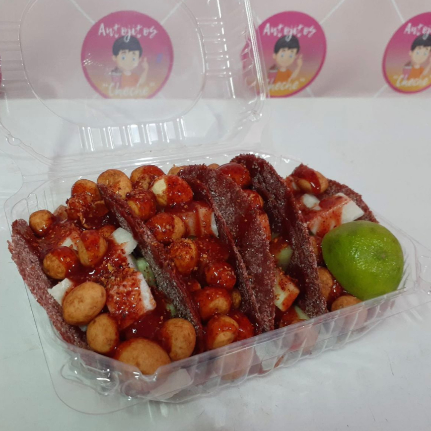 4 Tacos de tamarindo, con jícama o pepino, cacahuates, rielitos de tamarindo, tajín, y limón.