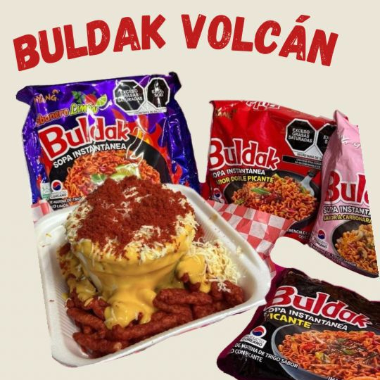 Sopa Coreana Buldak preparada con sus complementos (Queso en polvo con especias y chile Buldak), adicional elote, queso amarillo, mantequilla, queso Menonita rayado, 1 papas a elegir y flaming en polvo.