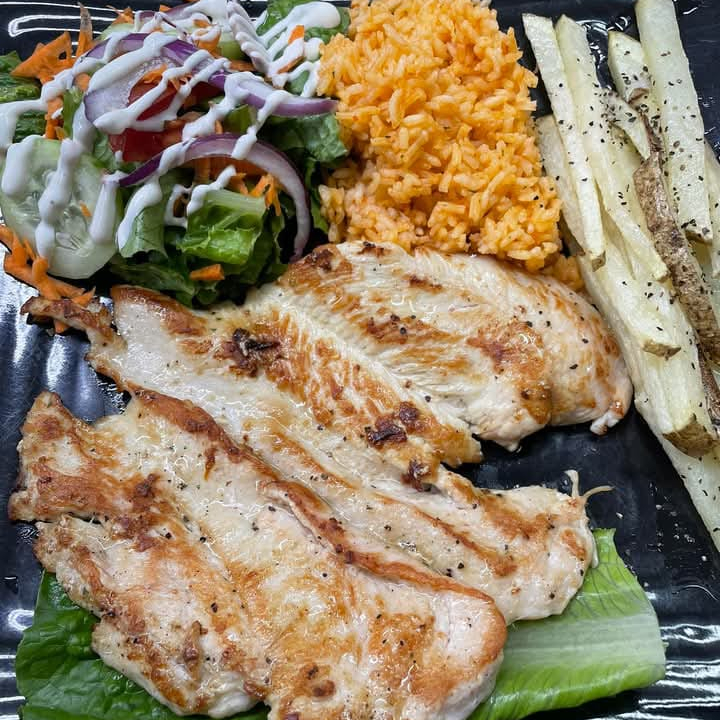 pechuga fresca acompañada con arroz, frijol y ensalada