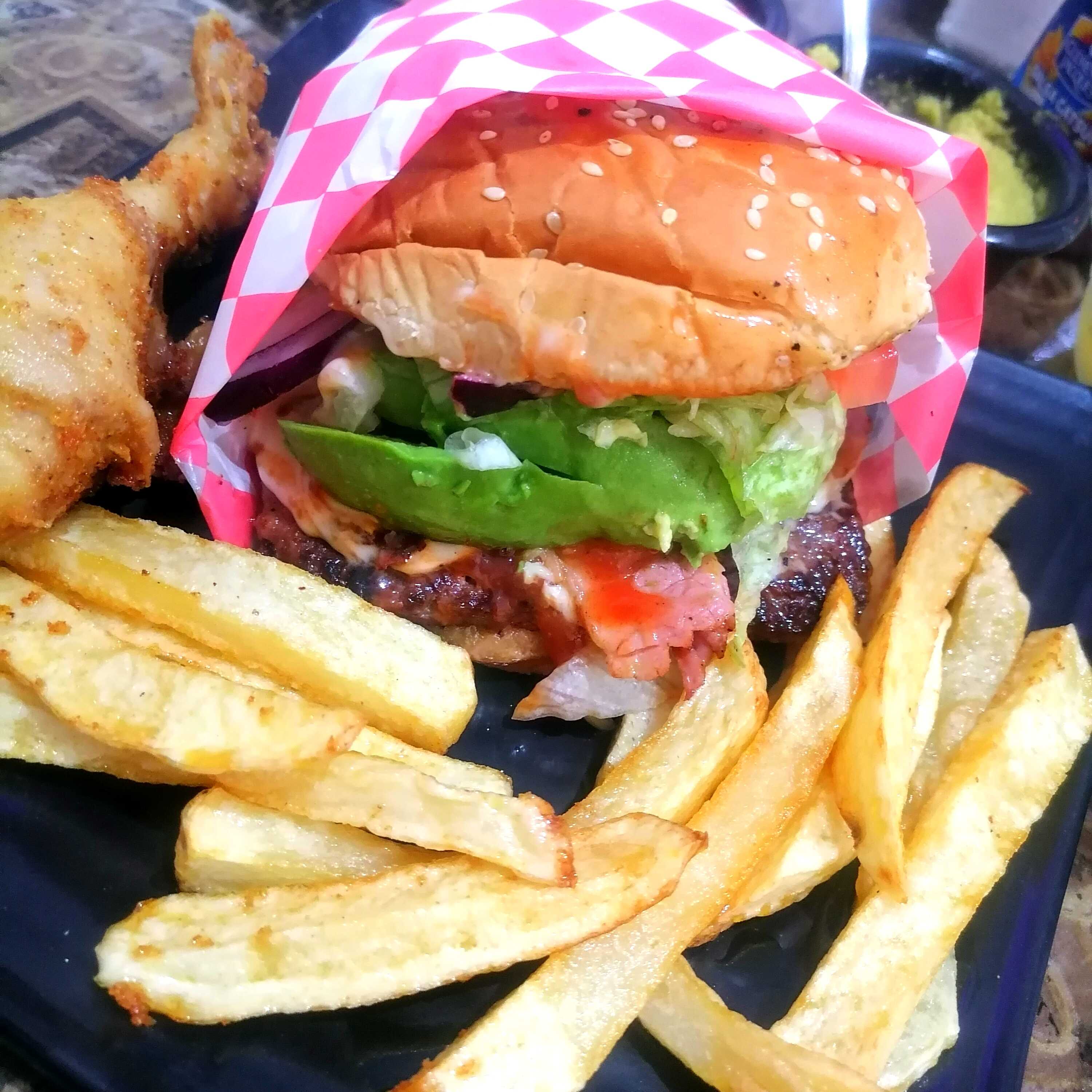 carne sirloine, pechuga de pollo, aguacate, jamon, tocino y papas fritas